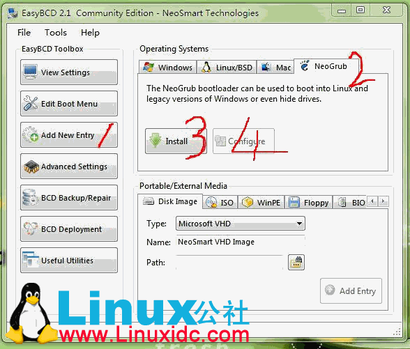 安装完成后打开EasyBCD,选择 Add New Entry — NeoGrub — Install — Configure