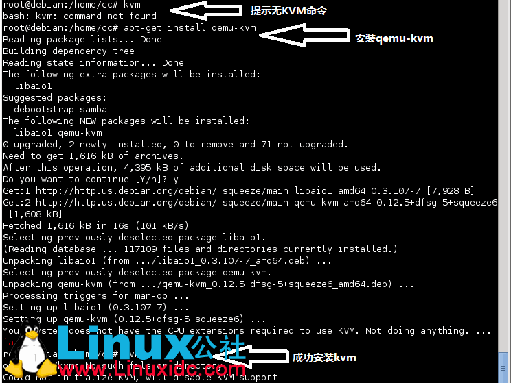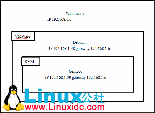 环境:Win 7 中安装WMWare 8.0; WMWare 中安装Debian 6.0;Debian中安装qemu-kvm; qemu-kvm中安装Gentoo (如下图所示)