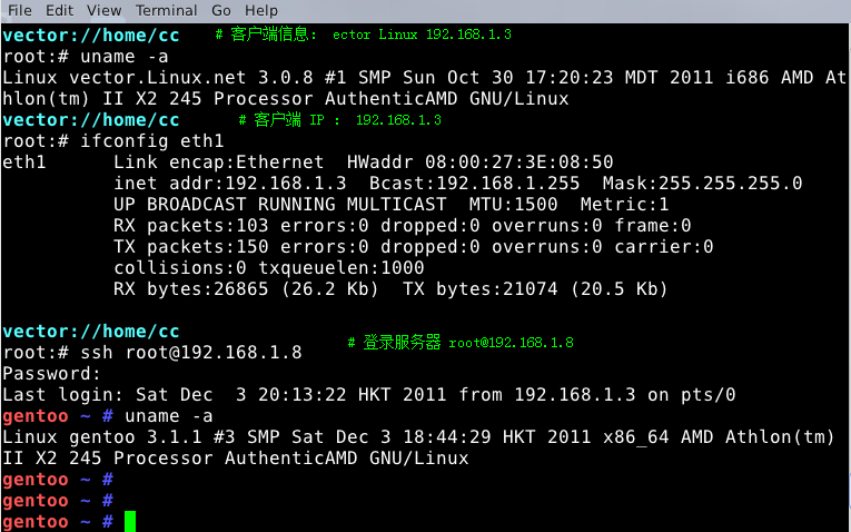 方法一:默认以密码验证方式登录(ssh-server:192.168.1.8 ssh-client:192.168.1.3)- # ssh root@192.168.1.8