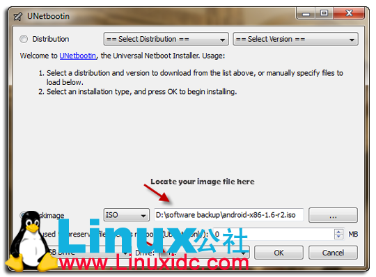 我已经在我的Windows平台上下载好了UNetBootin。你所有要做的就是插入你想要安装android系统的驱动器,UNetBootin会解压你下载的android系统的ISO然后安装到你选择的目标驱动器,你安装的第一步就像下图所示: