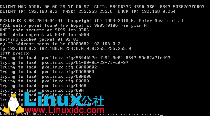 机器启动的时候,发现硬盘里面没有操作系统,光驱里面也没有引导光盘,这个时候,它开始用网卡的PXE功能启动,它先发送广播包,来获得IP地址,DHCP服务器会分配给他一个IP地址,并且告诉它去192.168.0.254上的TFTP服务器上下载pxelinux.0这个引导文件。