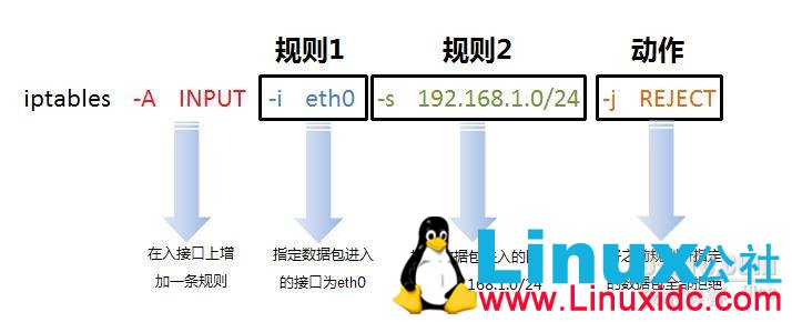iptables [-t 表名] <命令> [链名] [规则号] [规则] [-j 目标]