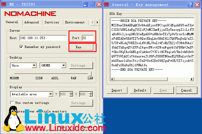 二、WinXP通过NX Client远程遥控Ubuntu : 下载安装Windows版本的NX Client:http://www.nomachine.com/download-package.php?Prod_Id=3655 运行NX Connection Wizard进行配置:1. 从服务器端(Ubuntu)的下述文件中拷贝出私钥,粘贴到DSA Key对话框中,如下图所示: