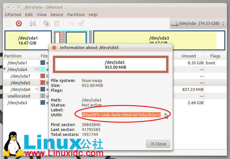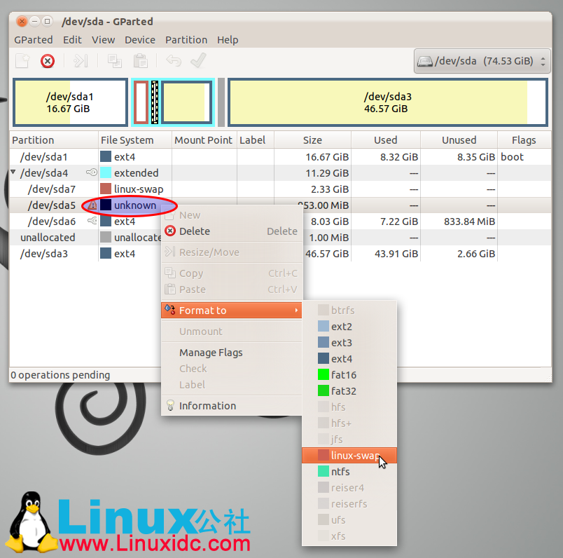 #2,打开GParted,找到交换分区(交换分区一般很小,看你所分大小了),然后格式化该分区