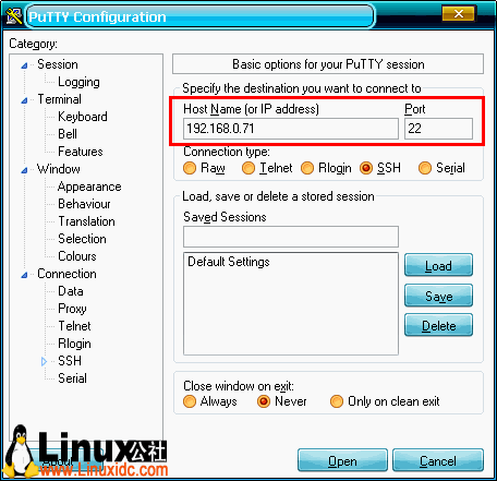 其次,打开Putty客户端,出现以下界面,填入相关参数: