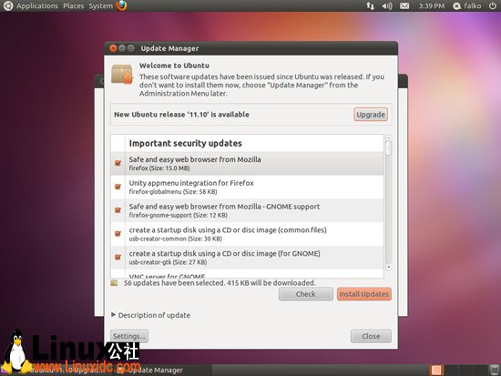 更新管理器应该显示一个新的发行版本(11.10)。点击升级按钮,开始升级: