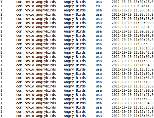 private static String sql="select top, id, name, country, dtime from gametop800 where id=\"com.rovio.angrybirds\"";