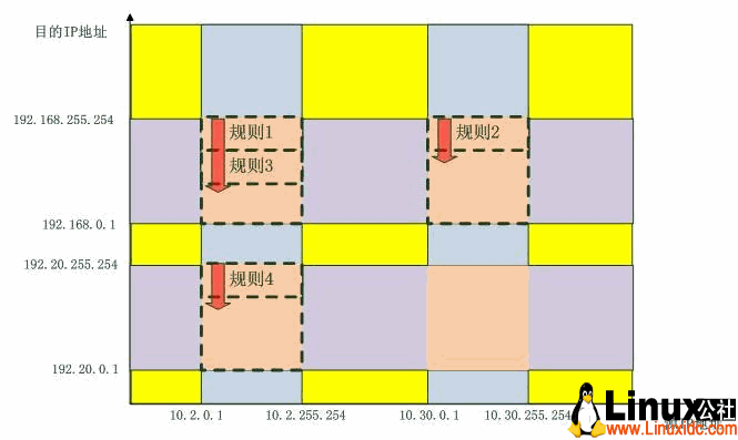 最终,只有虚线所围的区域有规则要匹配,只有数据包“掉进了”这些区域,才需要匹配规则,否则全部按照“策略”行事。当然,一个数据包不可能掉进两个区域。这里只考虑了源IP地址和目的IP地址这种二维的情形,如果加上第四层协议,端口等信息维度,匹配就更加精确了,并且,只要使用的“类”匹配算法足够精巧,操作是不会随着规则的增加而增加的,而这一部分内容正是我们马上就要讨论的内容