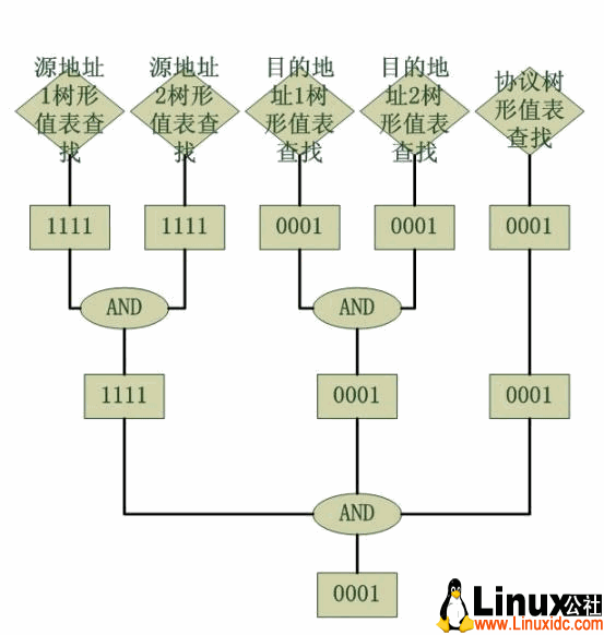 这个步骤是可以并行的,比如可以同时在两个处理器上查找“源地址1”的值表和“源地址2”的值表,从而最大化CPU利用率,以最快的速度得到两个位图,算法对于采用何种查找算法没有规定,取决于添加ACL时如何将匹配域的值插入对应值表。另外,哪种查找快用哪种,这是不争的事实,我们一般很少有动态插入的,一般都是静态插入的,因此对数据插入的性能要求并不高,关键要素是查找。这个查找算法的查找效率非常重要,好的算法如果是O(1)的,那就意味着匹配规则的过程消耗的时间不会随着规则的增加而增加,事实上即使是O(n)的查找算法, 也将N次的匹配操作转化为了按照一个比例小得多的a*N次的查找操作,往往a是一个很小的且小于1的数字...