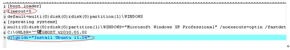 在一键GHOST的安装目录下重新新建一个menu.lst文件(该文件夹下原来就有一个menu.lst文件文件的,那是GHOST启动时用到的,将其命名为menu0.lst就可以,Ubuntu安装完毕之后再改回来就是)写入内容如下: