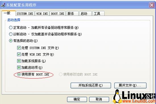 也可以在系统配置实用程序中看到该原有boot.ini文件的内容: