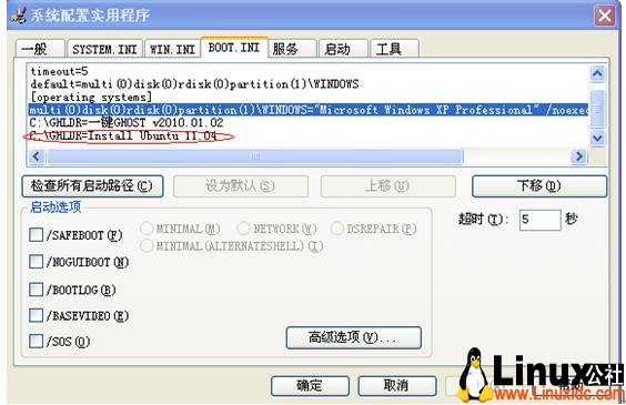 才能在C盘根目录中看到“boot.ini” ,也可以在“运行”中输入“c:\boot.ini”,会自动打开该文件。在打开的boot.ini文件中,修改其timeout等待时间,在文件末尾添加:c:\grldr="Install Ubuntu 11.04"