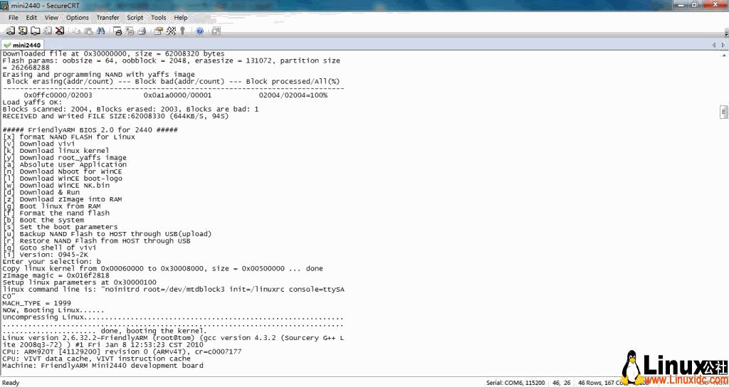 第四步:连接串口到开发板,打开开发板电源,出现下图(本人使用的是friendlyARM开发板,mini2440)。