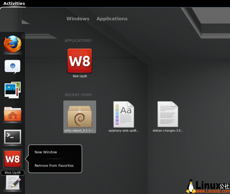 GNOME3.2 Epiphany Web浏览器通过了“Web应用程序模式”,能够网站保存为Web应用程序。这些Web应用程序显示在GNOME-shell和Unity桌面的应用,并可以固定在GNOME Shell Dash 或Unity launcher 中。
