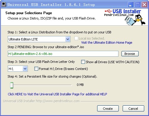 在Setp 1下拉列表中选择你要安装的linux版本,在Step 2中找到你的linux的iso文件,在Setp 3中选择你插入U盘的驱动器号,比如 H:,效果如下图: