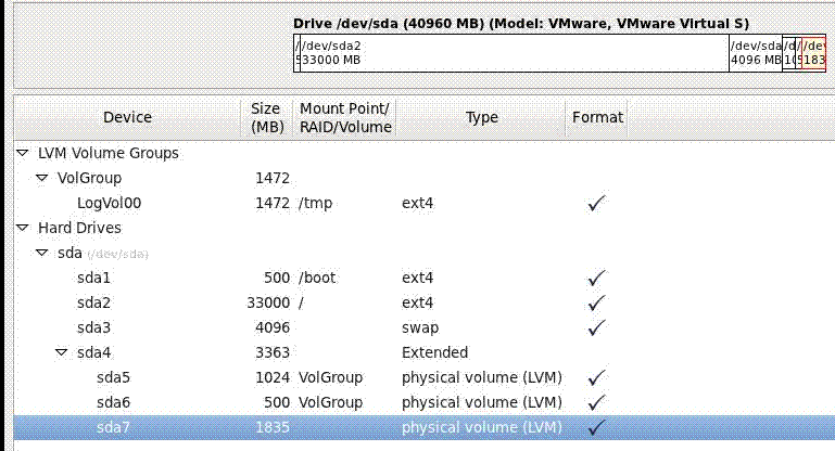 - /dev/sda7 80128000 83886079 1879040 8e Linux LVM