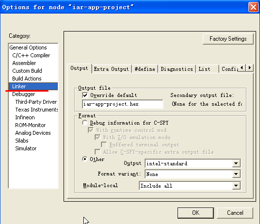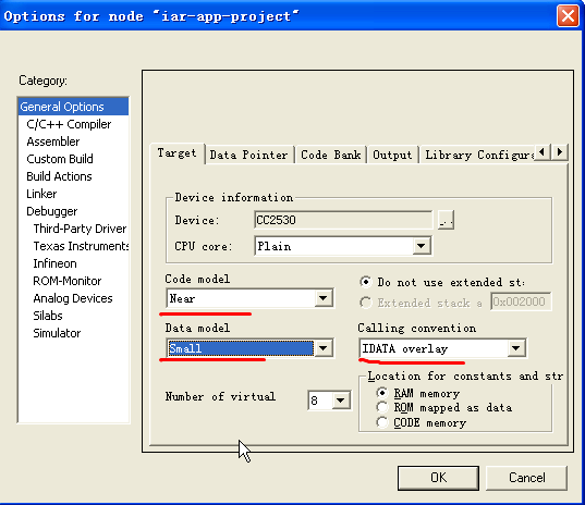 因为IAR没有破解成功,运行时候会提示错误Fatal Error[Cp001]: Copy protection check, No valid license found for this product [20] Error while running C/C++ Compiler。但是,到此阶段已经生成了我们需要的app.c文件。拷贝此文件到Windows下使用IAR Embedded Workbench进行编译,值得注意的是在编译之前需要对工程进行设置,设置如下: