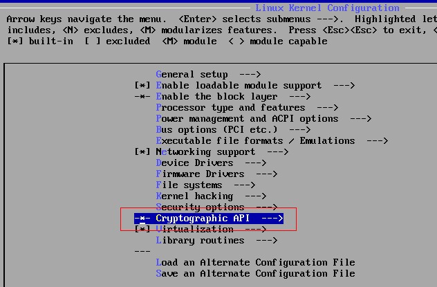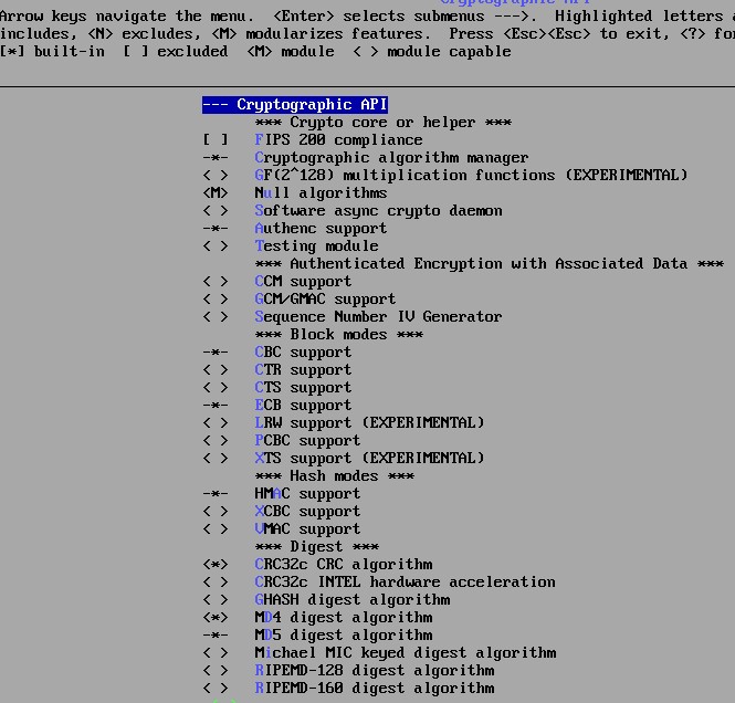 从2.6.6版本之后,内核源码就提供了丰富的密码学算法支持,需要配置编译选项将加密算法作为模块编入内核。如图所示,menuconfig的时候配置这部分选项