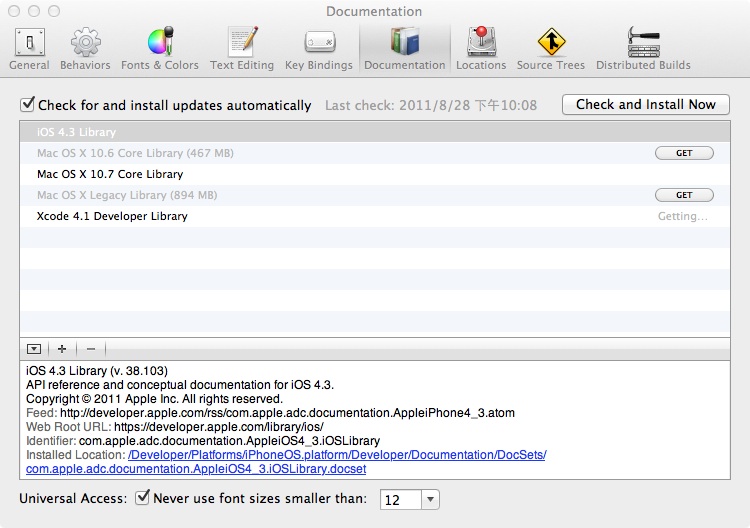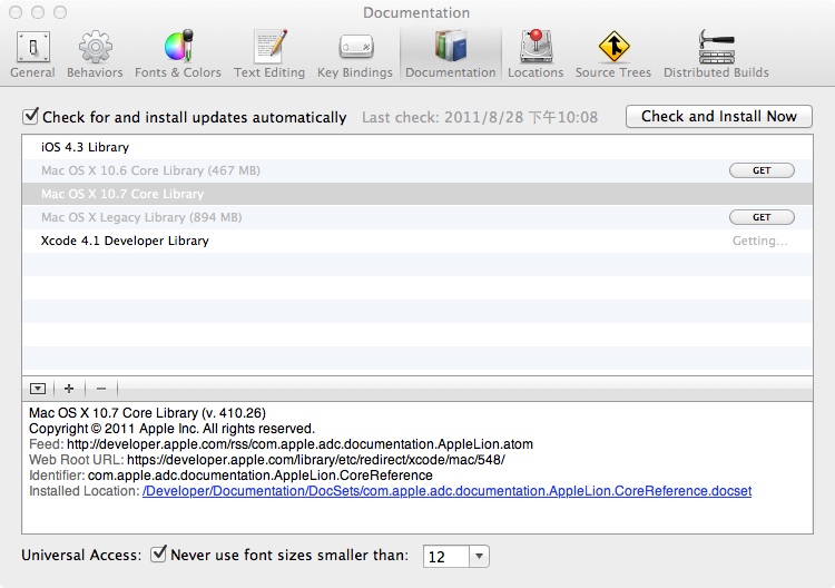 在全新安装Lion之后,App Store下载安装了Xcode,发现并没有附带iOS和Mac OS X Lion的编程参考文档(Library)。