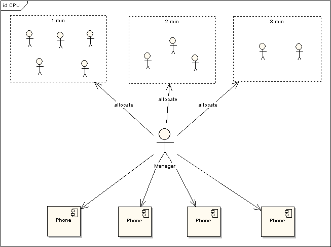 上图中对于使用电话的用户又作了一次分类,1min的代表这些 使用者占用电话时间小于等于1min,2min表示使用者占用电话时间小于等于2min,以此类推。根据电话使用规则,1min的用户只需要得到一次分配即可完成通话,而其他两类用户需要排队两次到三次。