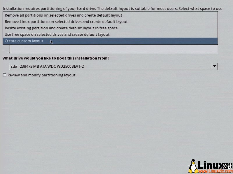 笔者的环境是这样的,在一台Lenovo S10-3t可旋转触屏的上网本上已经安装了MeeGo 1.1的Netbook版本,由于最新推出了MeeGo 1.2 tablet预览版,笔者想同时体验一下,需要在同一台上网本上再安装上Tablet系统。下载镜像,写入U盘,然后从U盘启动,在进入到处理分区的如下页面时,我们需要选择“Create custom layout”。