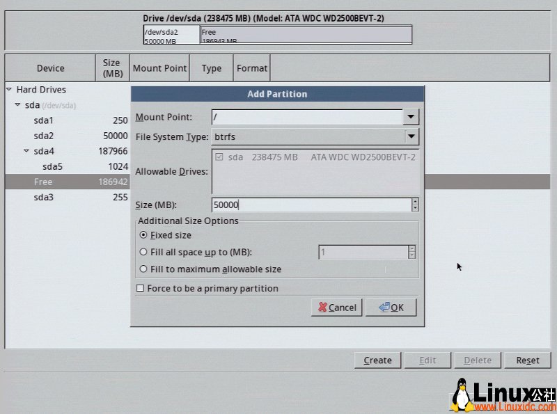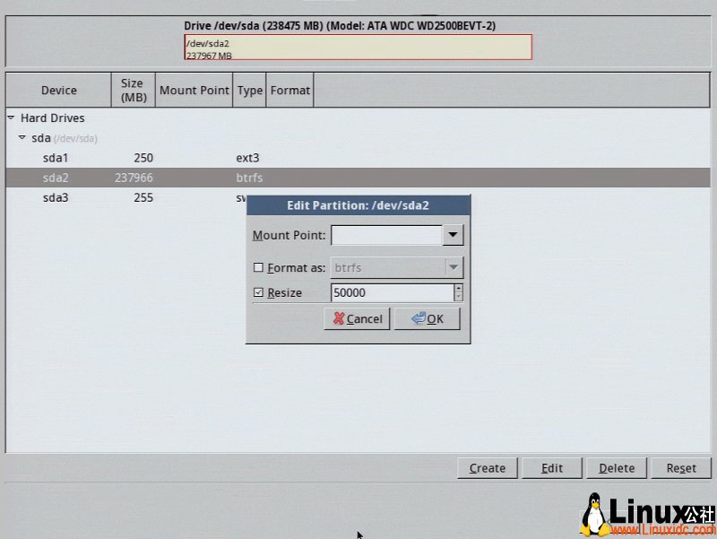首先调整原来的根分区,把多余空间留出来。这里我们将原来的根分区(下图中的sda2)调整到大概50G,应该是足够用了的。