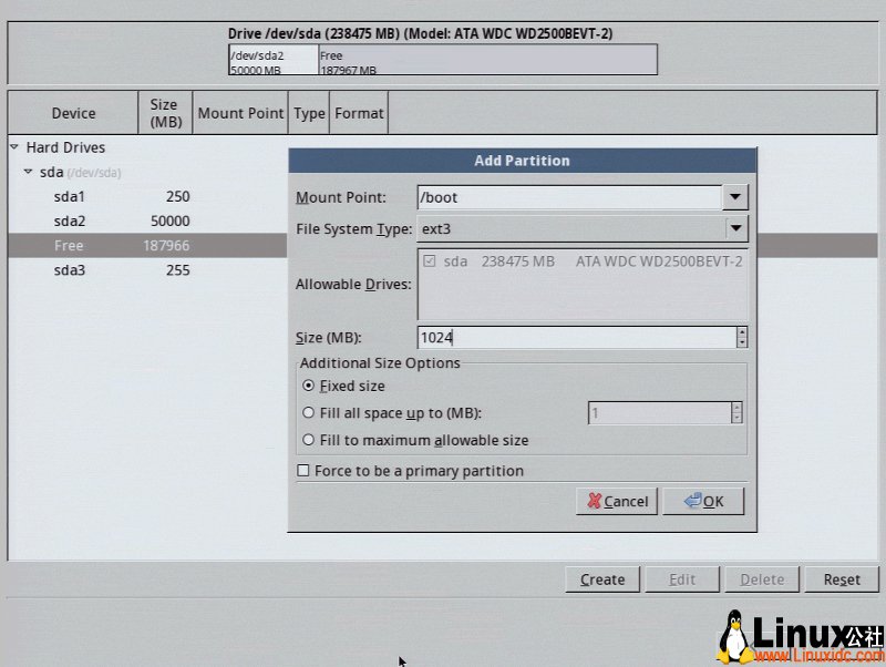 然后在多出的空闲分区上为新的MeeGo系统分配空间:分配一个/boot分区(/dev/sda5)和一个根分区,大小可以分别是1024M和50G。 swap分区可不用重新分一个新的,共用已经安装的系统的即可。
