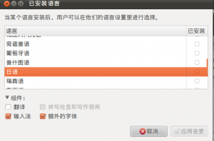 学习小语种的亲,Ubuntu添加外语输入法很简单的。还是在上文所说的系统设置菜单里,底部有个“语言支持”,进入点击“添加或删除语言”,找亲所需要的语言(我以日语为例吧)。点击,勾上“输入法”,额外的字体可选