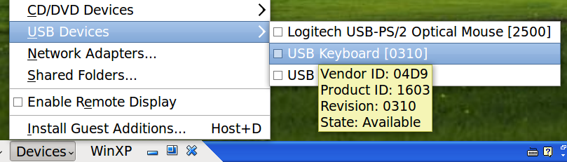 运行VirtualBox中的Windows XP(不插U盾),此时查看USB Devices菜单可能看起来是下面的样子: