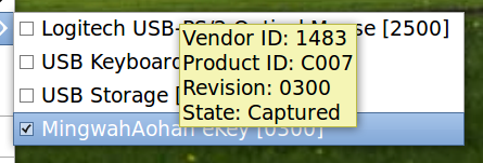 插上U盾,这时USB Devices会多一项,勾选前面的复选框,这时应该听到熟悉的“ 乓”的一声,说明U盾被识别了: