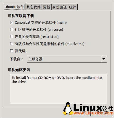系统 -> 系统管理 -> 新立德软件包管理器 -> 设置 -> 软件库 -> Ubuntu 软件