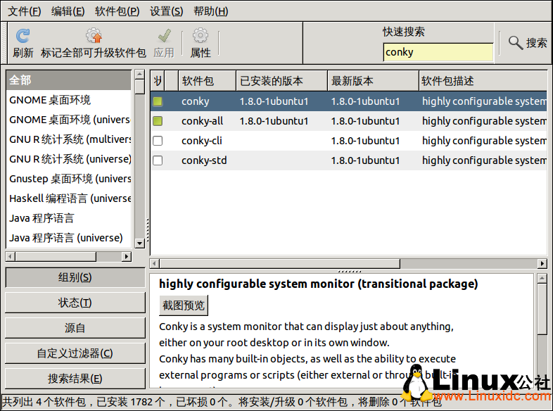 系统 -> 系统管理 -> 新立德软件包管理器 -> 快速搜索 -> 输入conky