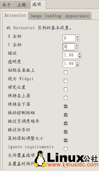 点选选项->screenlet,将X坐标设置为0,将Y坐标设置为0,取消取消保持在上层,选中保持在下层keep below。