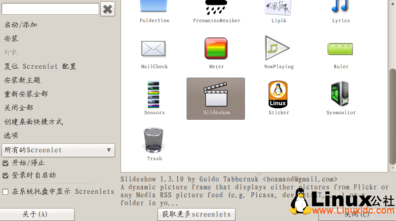 取消方式:打开screenlets,选中slideshow,然后将“启动/添加”“登录时自启动”前的对号取消掉。