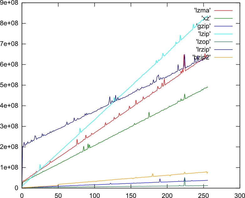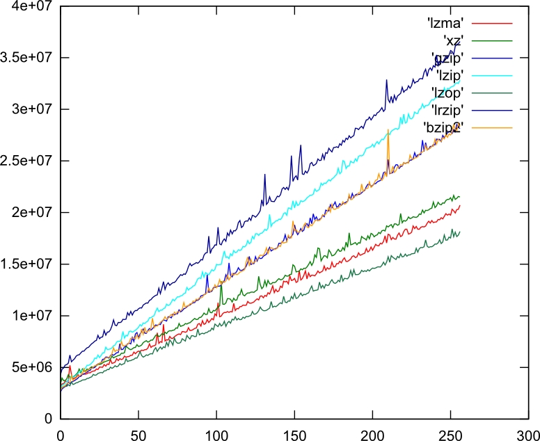 gnuplot <(echo "set terminal svg;set ylabel 'Time (nanoseconds)' textcolor lt 1; set xlabel 'Size (tens of kilobytes)' textcolor lt 2;plot 'lzma' with lines, 'xz' with lines, 'gzip' with lines, 'lzip' with lines, 'lzop' with lines, 'lrzip' with lines, 'bzip2' with lines") > test.svg