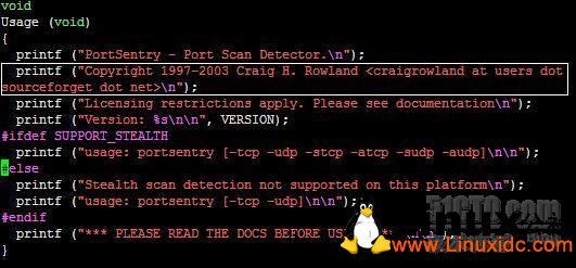 我们打开portsentry.c文件,在1590行左右,我们将带有Copyright 1997-2003字样的那行调整为一行即可,如下图所示