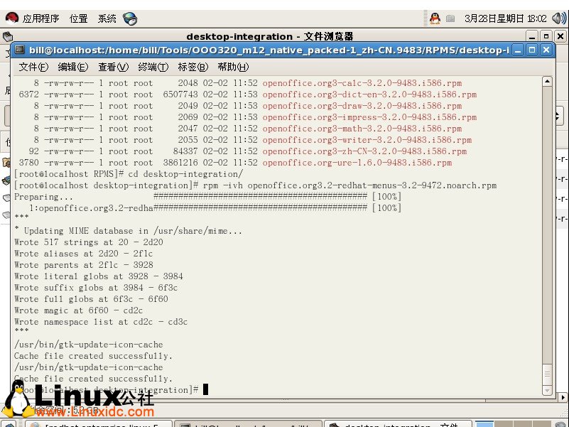 安装完成之后,接着安装 OpenOffice 界面程序,安装程序在 desktop-integration 文件夹下面,安装文件名为:openoffice.org3.2-redhat-menus-3.2-9472.noarch.rpm 执行命令进行安装。