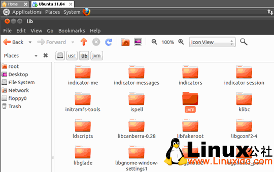 2、输入命令sudo nautilus打开root用户目录,在usr/lib目录下新建jvm目录,将jdk-6u25-linux-i586.bin拷贝到该文件夹。