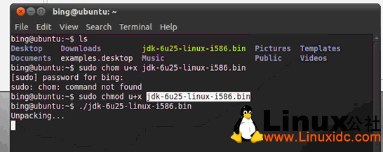 输入命令sudo chmod u+x jdk-6u25-linux-i586.bin加入了可执行权限