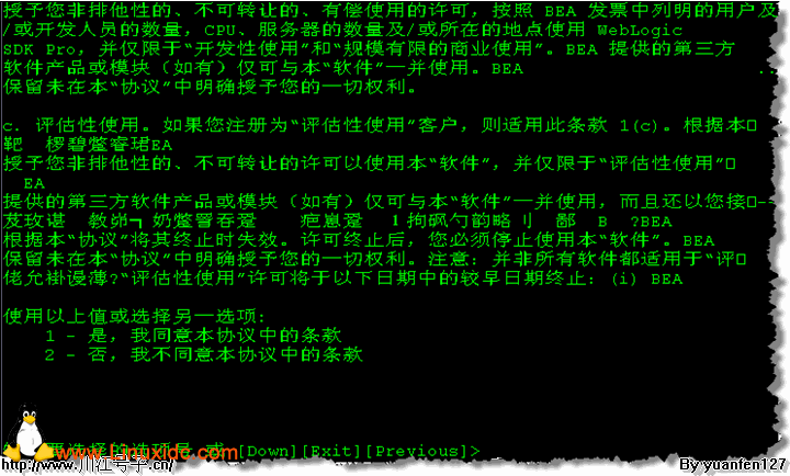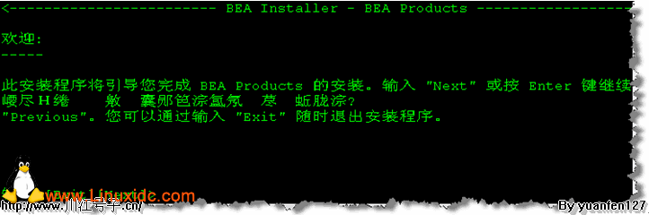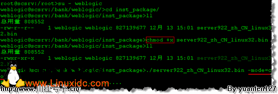 直接使用./server922_zh_CN_linux32.bin –mode=console即可执行。(如果是AIX系统,可能需要指定其他参数,请另外参考WebLogic for AIX的安装说明)。