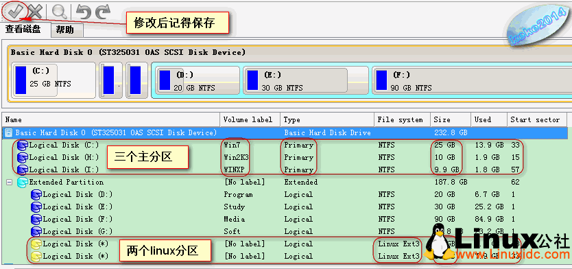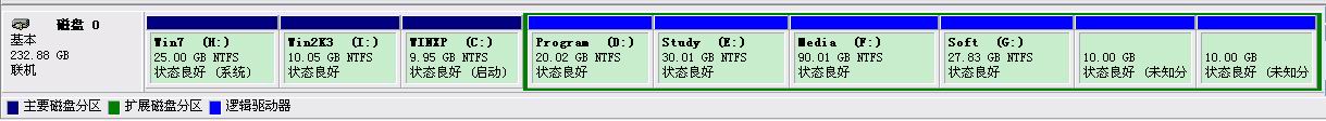 如上图所示,我分了三个Primary分区(主分区),分别装了Win7(25G)、Win2k3(10G)、WinXP(10G),由于Windows只支持4个主分区,我把剩下的所有空间格为Extended Partition(扩展分区——扩展分区其实就是一个逻辑分区集合,也被当做是一个主分区),然后可以在这个扩展分区中划分多个Logical Partition(逻辑分区),最后我留了20G,格式化为两个10G的ext3,用来装Linux。