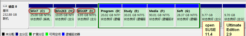 下面就来说说独立多系统的安装(Win7-Win2003-WinXP-openSUSE 11.4-Ubuntu Ultimate Edition 2.9):