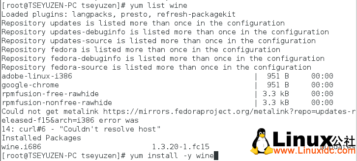 首先,装wine,我这人比较懒,喜欢用yum命令,先yum list一下看看有没有源,发现有,然后yum install -y wine 进行自动安装。
