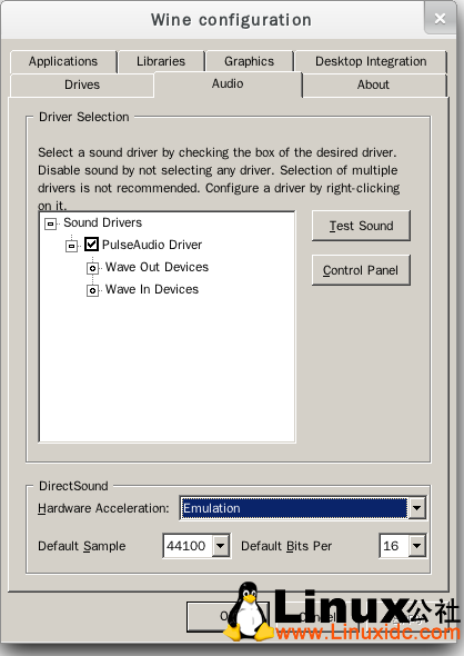我这时还不能听到声音,提示声卡驱动错误,这时打开wine configuration,在Audio里的硬件加速设置成emulation点apply即可解决,如图。
