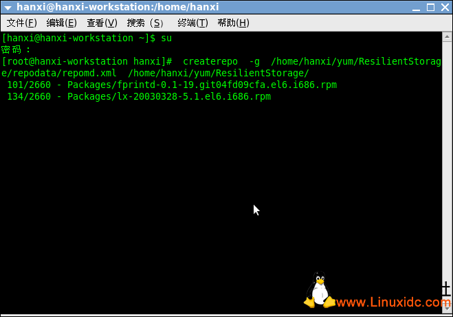 [root@hanxi-workstation hanxi]# createrepo -g /home/hanxi/yum/Server/repodata/repomd.xml /home/hanxi/yum/Server/