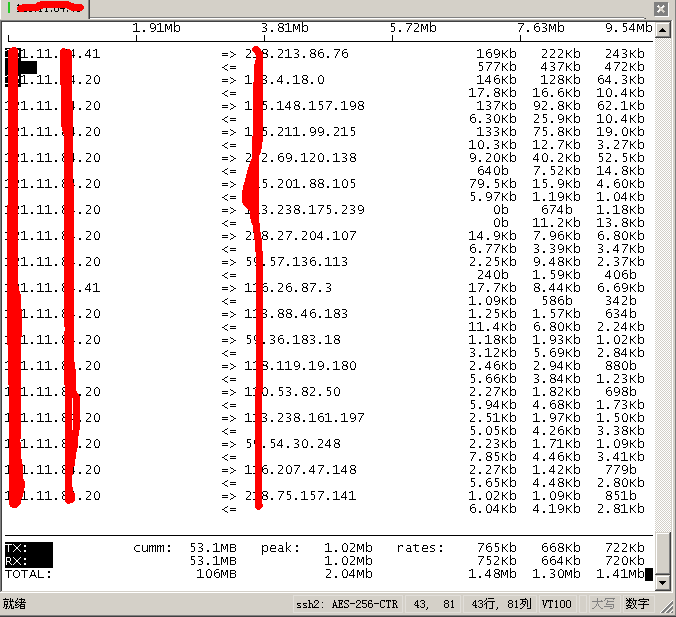 界面最下面的三行显示的分别是发送、接收、总计的流量,右侧值分别是总流量(过滤后的,没过滤就是全部的)、在此次刷新之前40秒内的峰值流量、最近2秒的平均传输速率、最近10秒的平均传输速率、最近40秒的平均传输速率。