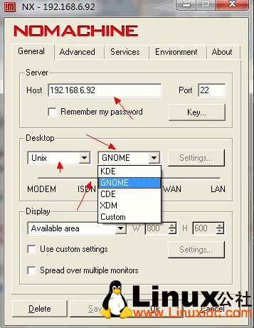 在这里我们需要输入Host 和 远程桌面类型。 现在基本用的是KDE 和 GNOME。 如果Linux 只安装了一个,就要选对。