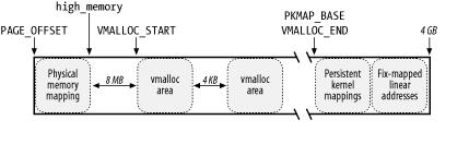 内核专门为此留出一块线性空间,从 PKMAP_BASE 到 FIXADDR_START (上图的倒数第二块区域),用于映射高端内存。在 2.4 内核上,这个地址范围是 4G-8M 到 4G-4M 之间。这个空间起叫“内核永久映射空间”或者“永久内核映射空间”。