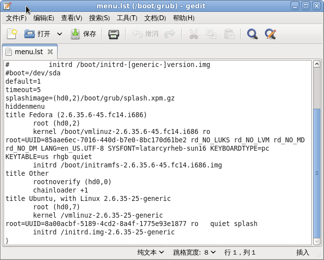 一、进入fedora手动添加。执行以下命令打开文件menu.lst: