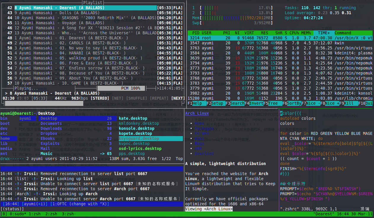 中文终端。据我所知,目前主要有两个解决方案:zhcon和fbterm。两个我都用过,zhcon较长时间不更新了,问题比较多。不小心加错参数,甚至可能会导致死机。所以我推荐fbterm,这个还是很不错的,要使用的话,必须开启framebuffer。虽然某些方面也有些瑕疵,不过就目前而言,应该算是一个比较好用的中文终端了。有人可能会问:“中文输入怎么解决?”嘿嘿,这个倒不用担心。比较简陋的有fbterm_ucimf,另外还有基于ibus的ibus-fbterm可供选择。